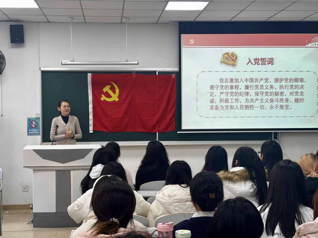 随后王蕾副书记代表学院党委寄语新党员,她提出了三点殷切希望:一是做有信仰的实干家,把理想信念融入日常——在专业选择、时事讨论中保持独立思考,在任务面前敢于担当、勇于作为;二是做有光芒的引领者,在集体中主动传播先进思想、树立榜样标杆,成为身边同学自觉看齐的示范;三是做政治上的明白人,始终保持清醒头脑,把握正确方向,将信仰追求转化为实际行动,在实践中不断成长。