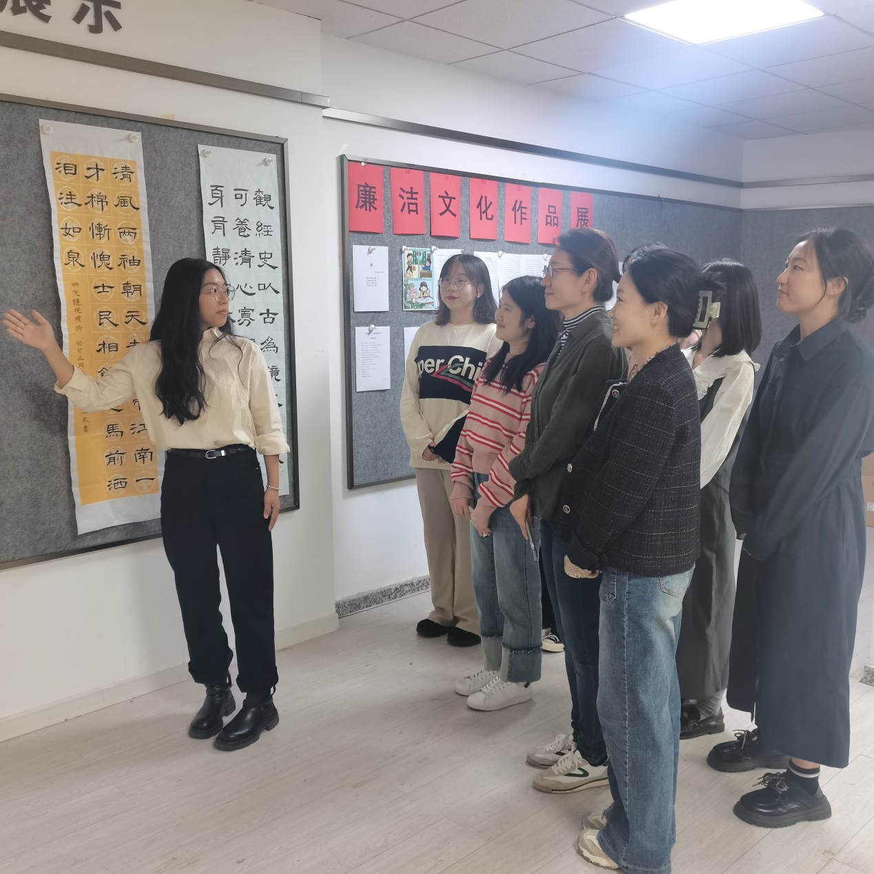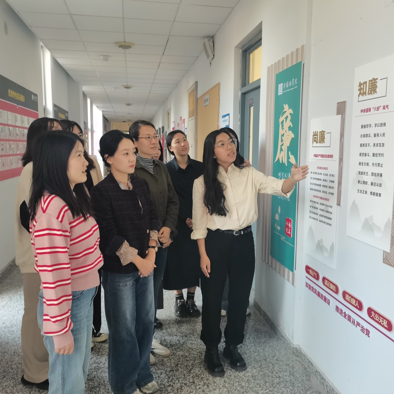 根据《天津科技大学关于推进清廉学校建设的实施方案要求》,外国语学院持续推进清廉学校建设,近期在学院长廊建设廉政文化墙,进一步营造廉政文化的氛围。文化墙以“尚廉”、“知廉”、“尊廉”三个板块呈现了《中国共产党廉洁自律准则》、中央倡导“八好风气”、“四大纪律八项要求”的内容;用古朴淡雅的莲花图案表达了清正廉洁的精神内核,让人不由得想起“予独爱莲之出淤泥而不染,濯清涟而不妖”的这句词,赞美清廉的高尚品格。文化墙建成后吸引了路过的师生驻足观赏、学习。