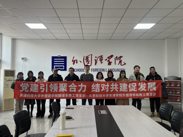 您现在的位置: 首页 >> 纪检监察 >> 工作动态 >> 翻译系教工党支部与北京科技大学天津学院外国语学院教工党支部开展共建活动——支部共建聚合力 协同育人启新程为深入落实我校“先锋计划”,扎实推动国家级一流本科翻译专业建设,发挥党建引领事业发展的根本作用,促进党建与立德树人深度融合,12月9日下午,天津科技大学外国语学院翻译系教工党支部与北京科技大学天津学院外国语学院党支部开展共建交流活动。双方通过座谈研讨与实地参访,共话党建引领,共谋发展新篇。
