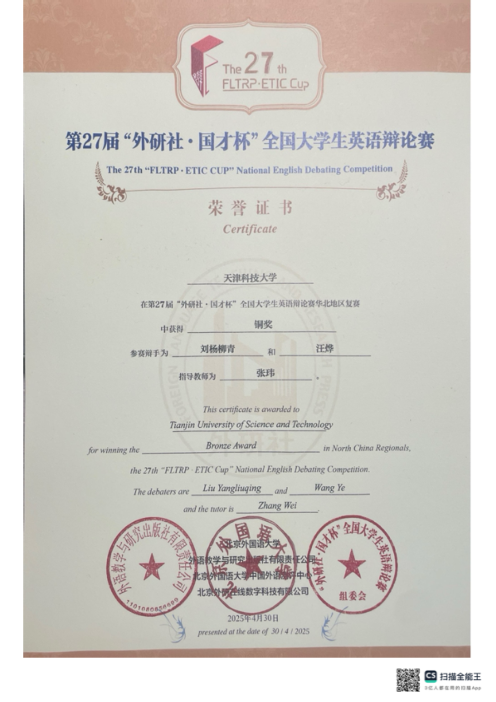 2、张玮老师指导刘杨柳青和汪烨在第27届“外研社·国材杯”全国大学生英语辩论赛中获得华北地区铜奖
