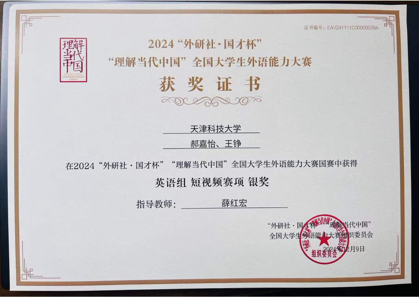 3、薛红宏老师指导郝嘉怡、王铮在2024“外研社·国才杯”“理解当代中国”全国大学生外语能力大赛国赛中获得英语组短视频赛项银奖