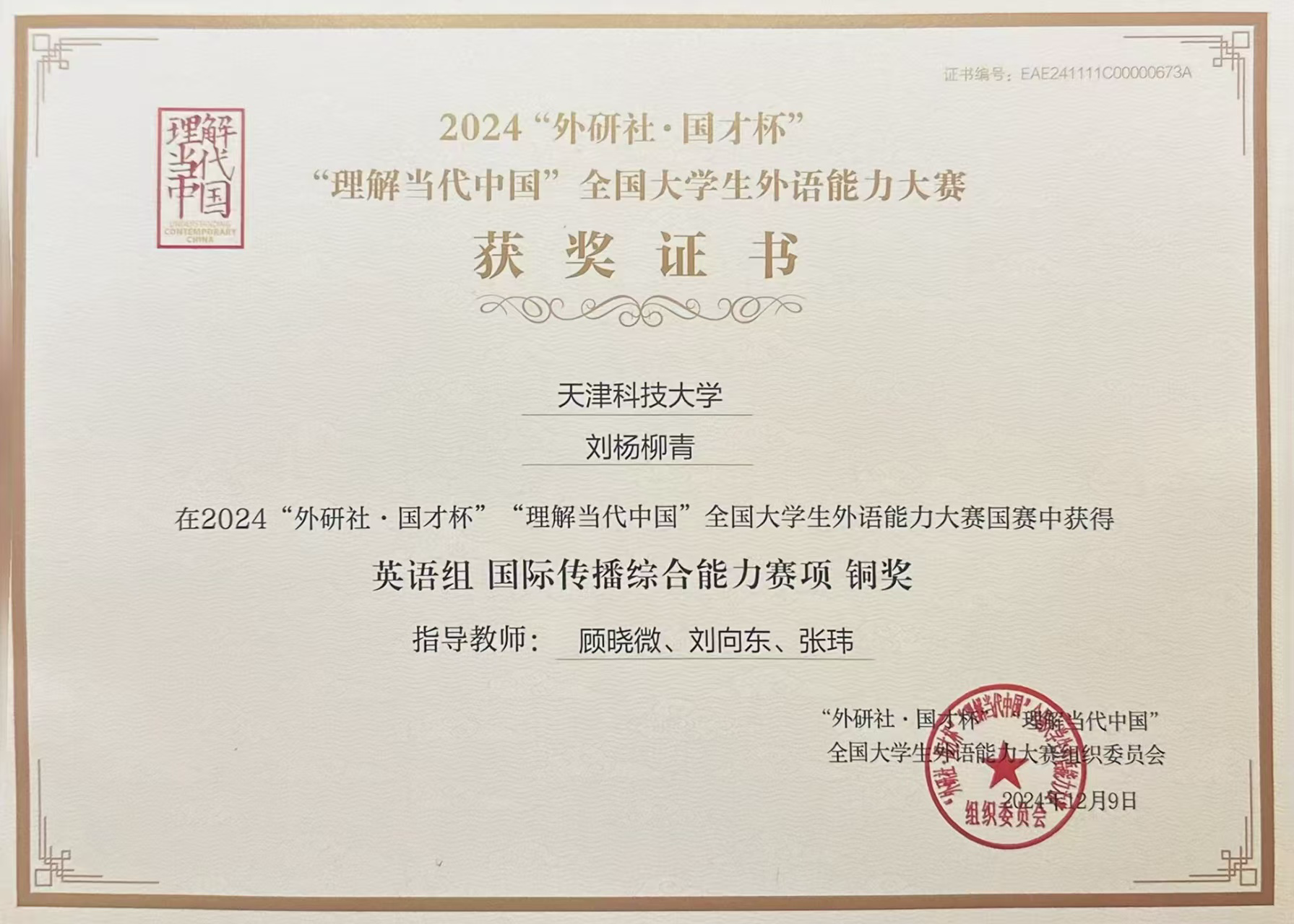 四、人才培养 在培养学生的专业技能、文学文化素养方面,我中心持续深化教学与实践的融合,依托丰富的科研项目与学术资源,通过课程教学、学术讲座、竞赛指导、实习实践等多种方法,全面提升学生的外语应用能力、跨文化理解力与学术创新能力。2025年度,中心教师指导我院本科和研究生在中外文学与文化传播等外语类学科竞赛中取得优异成绩,具体成果如下: 1、张玮老师指导刘杨柳青在“外研社·国材杯”“理解当代中国”全国大学生外语能力大赛中获得全国铜奖