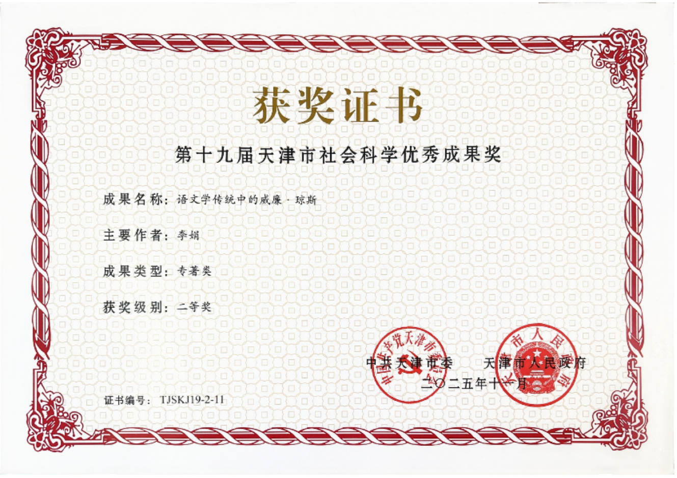 2、期刊论文 (1)宋赛南:《米兰达<印第安地图学>中的地图政治》,《外国文学》(CSSCI),2025年7月。 (2)李娟:《语文学与历史:威廉·琼斯的“中国文明印度起源说”》,《中外文化与文论》(CSSCI辑刊),2025年3月。 (3)孙斐瑾:《大学英语短篇小说阅读教学中的问题分析及路径探究》,《教育理论与实践》(教育学核心期刊),2025年2月。 (4)李娟:《<语文学与中国比较文学——传统与未来>评介》,《天津外国语大学学报》(外语类重要期刊),2025年3月。 (5)宋赛南:《威廉·琼斯“语文学家”身份与语文学的双重回归——评<语文学传统中的威廉·琼斯>》,《语言与文化研究》,2025年7月。 (6)李敏,张帅:《从隔绝到重生:论村上春树小说中“墙”的意象变迁》,《阜阳师范大学学报》,2025年5月。 (7)吴建欧,籍晓红:《现代性视角下<纯真年代>中女性漫游者的自我认同焦虑与探索》,《世界文学研究》2025年8月。 (8)赵俊槐:《東アジアにおける「二十四孝」の資料整理と文字校正》,《アジア遊学》,2025年1月。 (9)宋赛南:《印第安复兴视角下<风中奇缘>与<阿凡达>的比较研究》,《名作欣赏》,2025年1月。 3、学术获奖 2025年11月,李娟副教授《语文学传统中的威廉·琼斯》获第十九届天津市社会科学优秀成果奖二等奖。