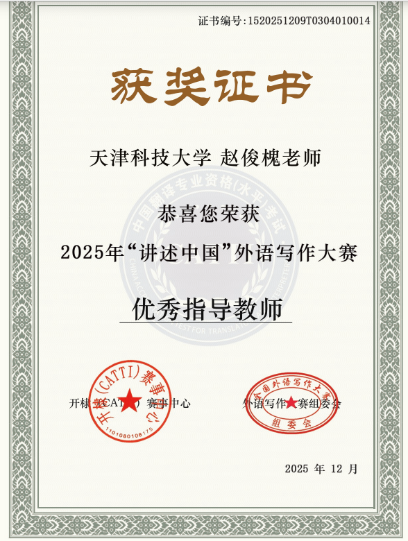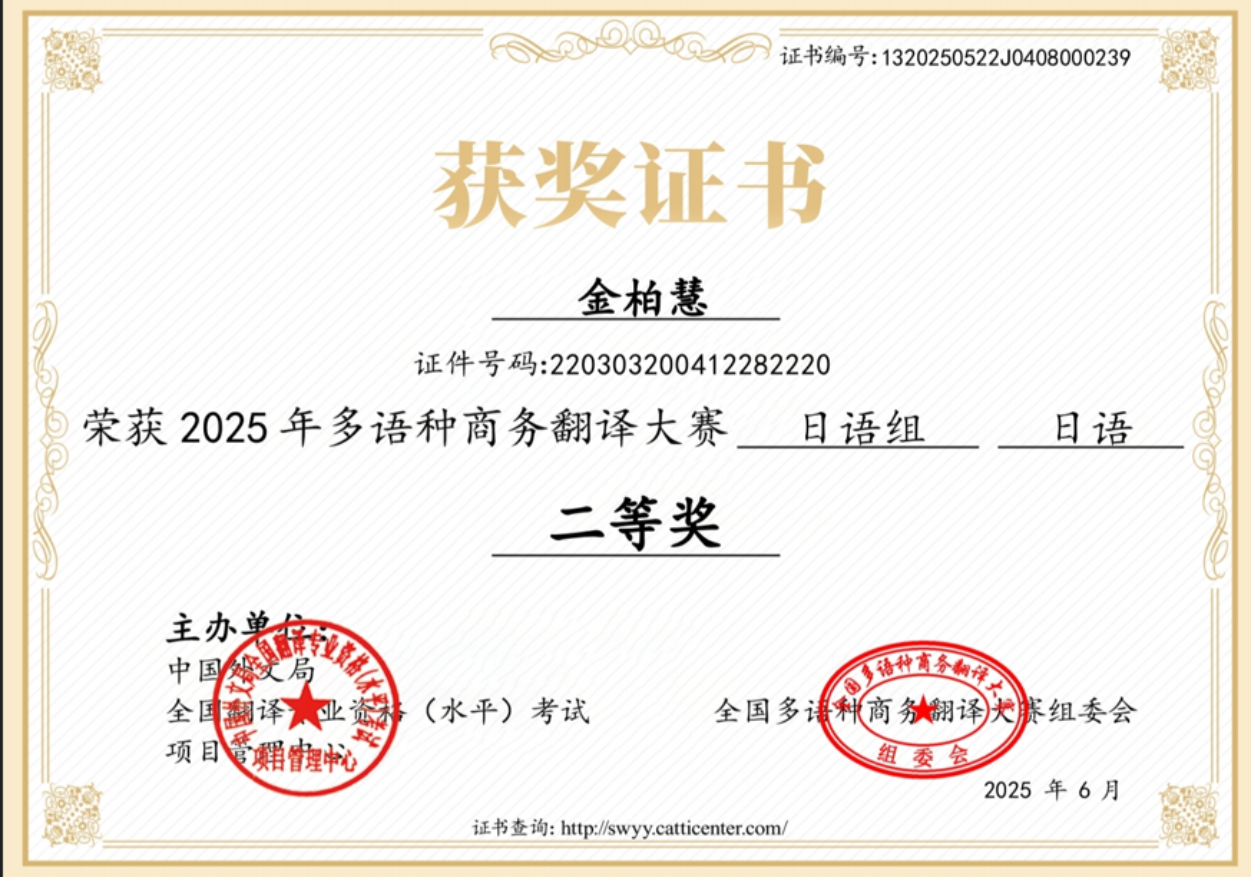 5、赵俊槐副教授指导金柏慧在2025年多语种商务翻译大赛中获全国二等奖。 6、赵俊槐副教授指导杨菲菲在CATTI举办的2025年“讲述中国”外语写作大赛中获日语组二等奖。
