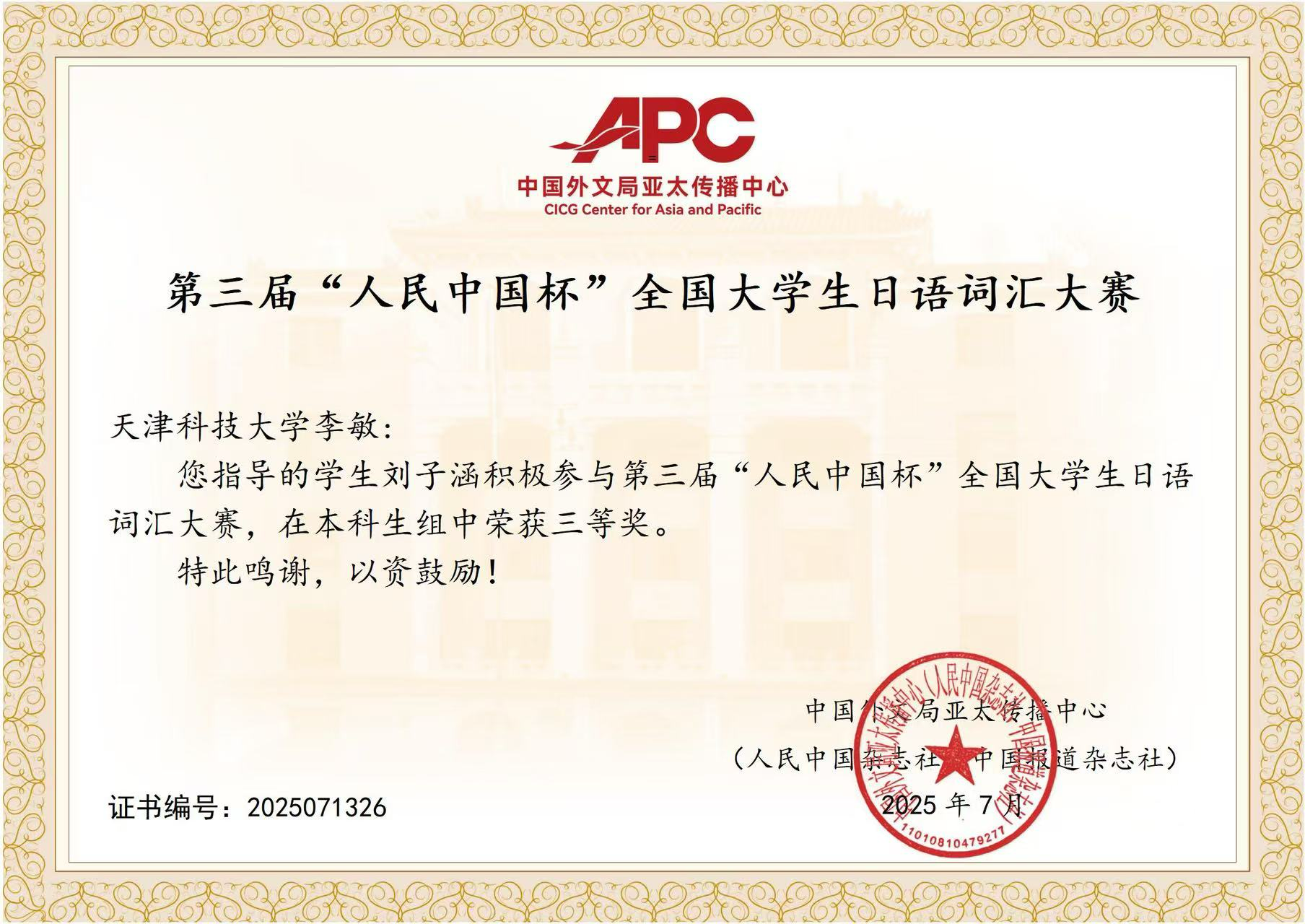4、李敏副教授指导刘子涵在第三届“人民中国杯”全国大学生日语词汇大赛中获三等奖。