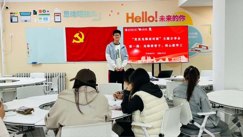 您现在的位置: 首页 >> 新闻动态 >> 学院新闻 >> 党员先锋面对面丨我院举办党员先锋面对面主题分享会第一期:先锋带骨干,同心做学工为深入学习贯彻习近平新时代中国特色社会主义思想,充分发挥学生党员先锋模范作用,引导广大学生骨干坚定理想信念、提升工作能力,4月17日,外国语学院于一公寓学业加油站举办“党员先锋面对面”主题分享会第一期。本次活动以“先锋带骨干,同心做学工”为主题,邀请两名学生党员代表分享学生工作经验与成长感悟。 分享会上,学生党员魏安帅结合自身学生工作经历,围绕学生工作的意义与价值展开分享。他指出,学生工作是提升综合素养、锻炼实践能力的重要途径,能够有效增强表达沟通、组织协调与团队协作能力,为个人成长与未来发展奠定坚实基础。他强调,作为学生骨干,要始终坚持以学业为本,合理平衡学习与工作;要淡化头衔意识,强化责任担当,立足岗位服务同学;要勇于尝试、不怕失败,在实践与历练中不断突破自我、成长进步。
