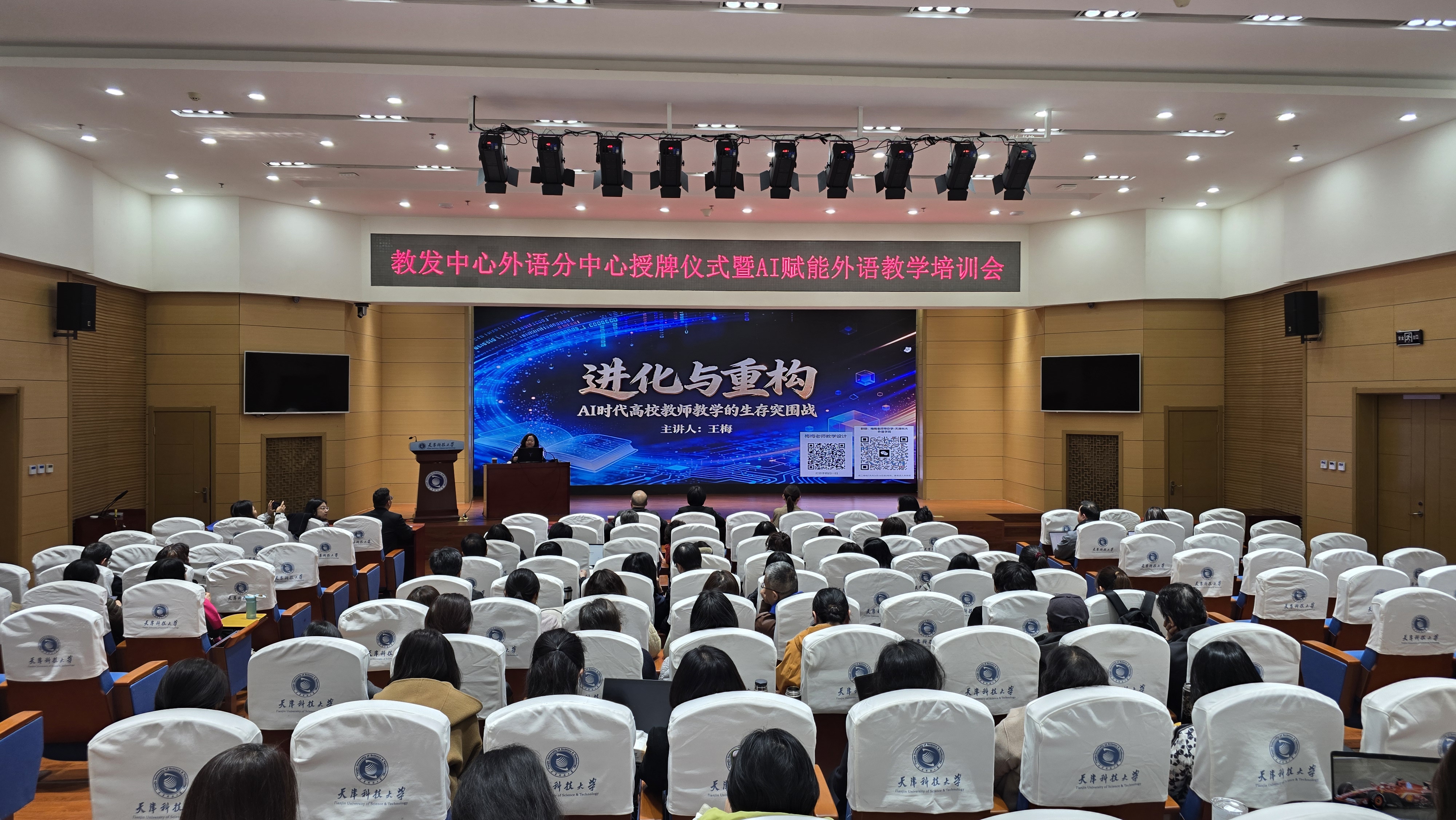 天津大学王梅教授作《进化与重构——AI时代教师教学的生存突围战》专题讲座。讲座分三大模块:“认知重构”指出AI是解放教师的机遇,教师价值引领与情感连接能力不可替代;“能力重构”演示“课前DeepSeek备课、课中AI可视化互动、课后AI辅助学情分析”的应用路径;“未来已来”强调外语教师应转型为“人文价值点燃者”与“学习路径设计者”。互动环节气氛热烈。 本次仪式圆满落幕,标志分中心正式启航。未来,学院将以“优师强教”为基、“智慧赋能”为翼,书写外语教育高质量发展新篇章。 |
