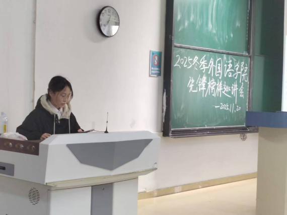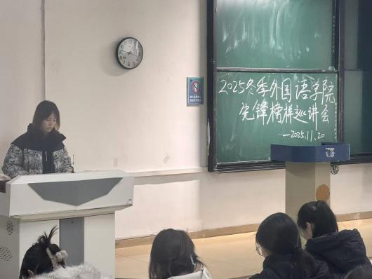 您现在的位置: 首页 >> 新闻动态 >> 学院新闻 >> 外国语学院先锋榜样系列巡讲会——学风建设品牌活动为充分发挥优秀学子的示范引领作用,帮助外院学子精准破解学业成长难题、科学规划校园生涯,我院举办“先锋榜样”巡讲会活动。天津科技大学外国语学院2025年11月20日 12:20 于图书馆第12阶梯教室举办2025年度冬季先锋榜样巡讲会,本次巡讲会特邀金柏慧、李春丽、胡云、姜立衡、吴丽琪担任主讲嘉宾,巡讲覆盖2024级与2025级全体同学。本次巡讲围绕多维度成长核心领域,为低年级同学带来深度分享。
