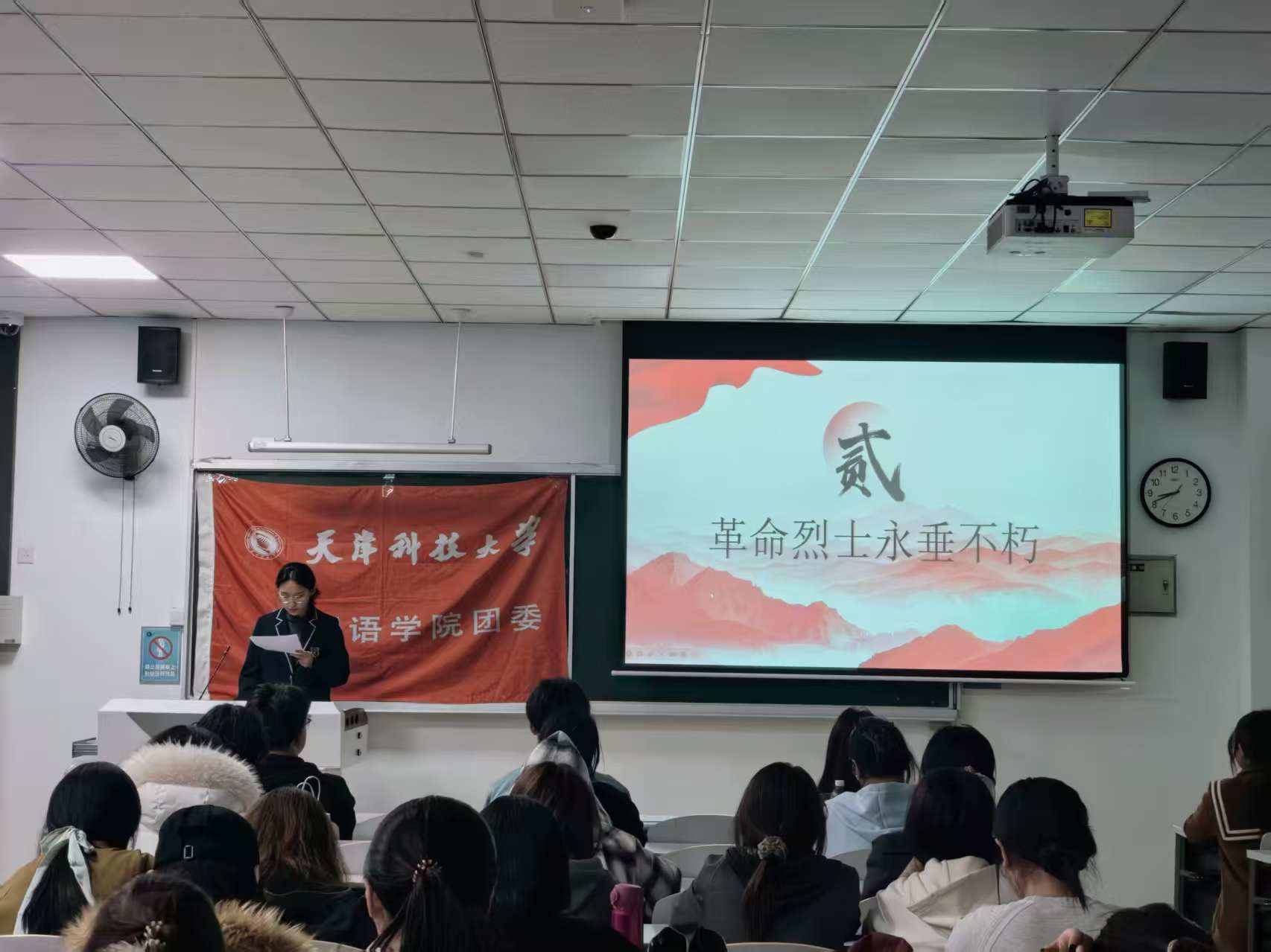 深化教育实践内涵,赓续精神血脉 围绕铭记历史与关爱奉献的主题,各团支部开展了一系列丰富多彩、富有教育意义的教育实践活动。2023级本科生团支部代表举办了“书信载衷情——写给革命先辈的一封信”征文与朗读活动,团员青年们通过文字与英烈进行跨越时空的对话,倾诉着对革命先辈的敬仰之情,表达着传承红色基因、为实现中华民族伟大复兴而努力奋斗的决心。 部分团支部举办的双语诵读会也别具特色。团员青年们用中英文朗诵以春天、生命、记忆为主题的经典诗歌,在优美的诗句中探寻生命价值的共同思考。这种双语诵读的形式,不仅发挥了外国语学院的专业优势,让团员青年在朗诵中提高了语言能力和文化素养,引导大家深刻理解生命的意义和价值,传承和弘扬英烈们的大无畏精神。