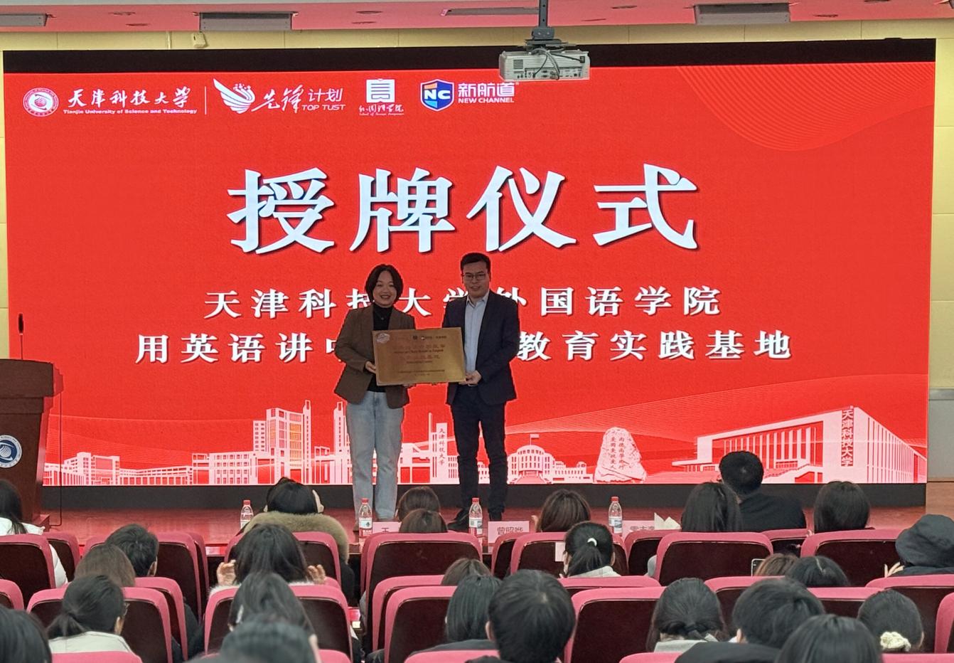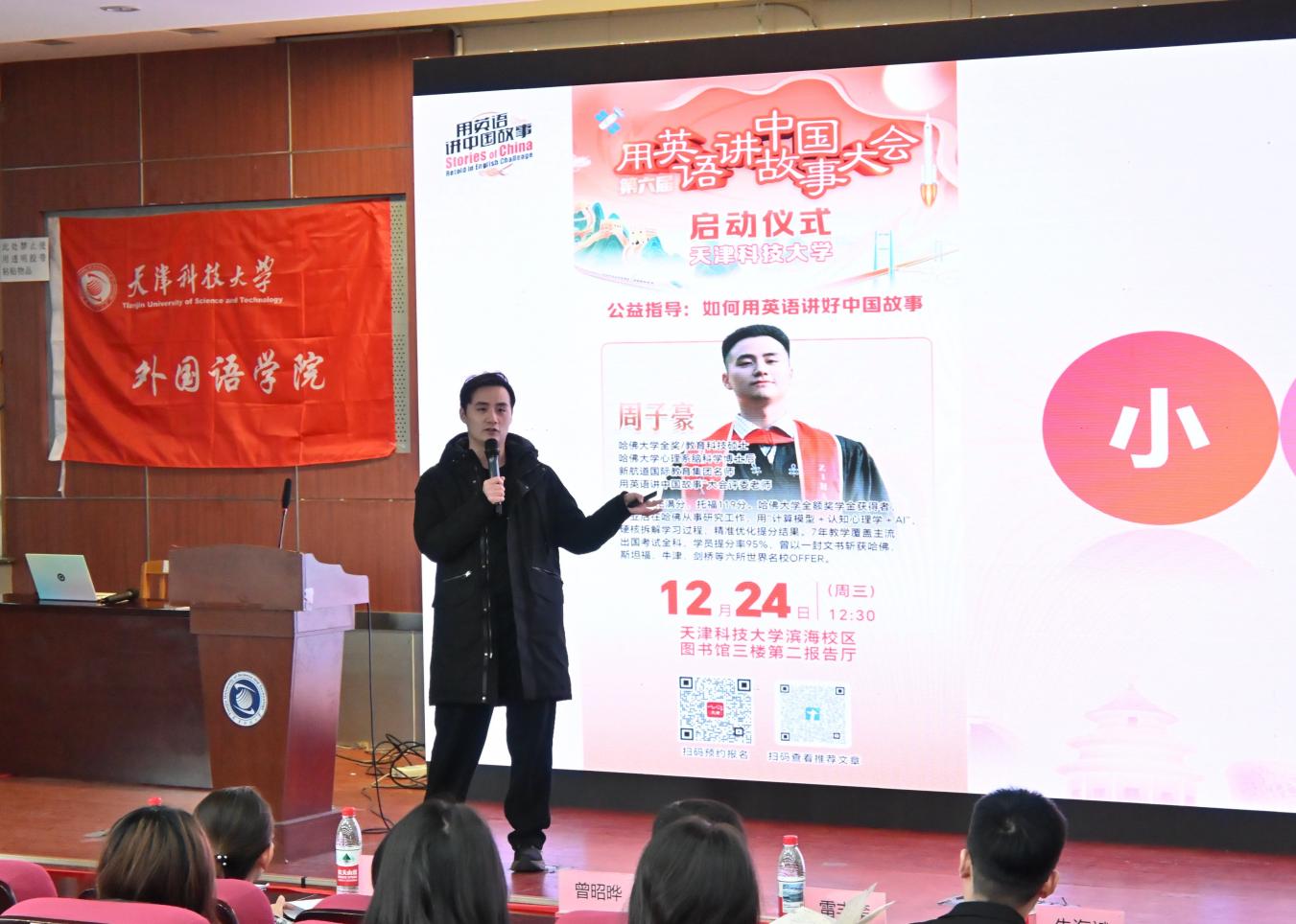 您现在的位置: 首页 >> 新闻动态 >> 学院新闻 >> 我校第六届 “用英语讲中国故事大会”正式启幕——以语为桥,传扬中国好故事为深入贯彻党的二十大“讲好中国故事、传播好中国声音”重要精神,推动思想政治教育与中华优秀传统文化传承深度融合,12月24日中午,天津科技大学第六届“用英语讲中国故事大会”启动仪式暨英语能力提升培训会在滨海中校区图书馆第二报告厅举行。本次活动由我校国际交流处、学工部、外国语学院联合新航道国际教育集团共同主办,吸引全校200余名怀揣文化传播热情的大学生齐聚一堂,共赴这场跨文化交流的盛会。 新航道国际教育集团副总裁、新航道天津学校校长、“用英语讲中国故事大会”天津组委会执行总指挥雷丰奎,新航道国际教育集团名师、“用英语讲中国故事大会”评委老师周子豪,外国语学院党委书记曾昭晔、副书记王蕾和师生代表共同参加活动。 启动仪式上,外国语学院、新航道国际教育集团举行“用英语讲中国故事教育实践基地”授牌仪式。这一基地的建立,标志着双方在文化育人、国际传播人才培养领域的深度合作迈入新阶段。