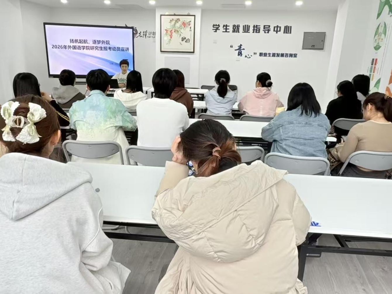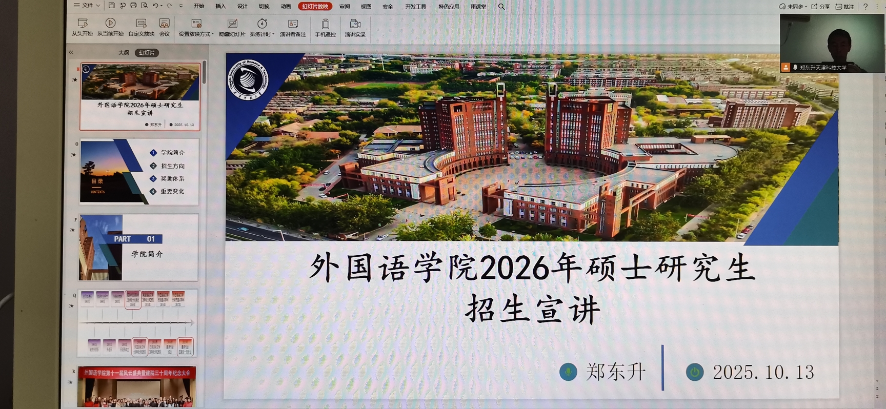 您现在的位置: 首页 >> 新闻动态 >> 学院新闻 >> 我院积极开展2026年硕士研究生招生宣传工作2025年9月至10月,外国语学院硕士研究生招生宣传工作组紧密开展招生宣传工作,先后于天津科技大学、天津商业大学宝德学院、河北北方学院、华北理工大学及内蒙古民族大学、长春师范大学 6 所高校,成功举办了2026年硕士研究生招生宣讲会,取得了热烈反响。 在天津科技大学专场,王莹、赵俊槐、刘向东、郑东升四位老师为到场学子全面介绍了我院学科优势与培养特色。