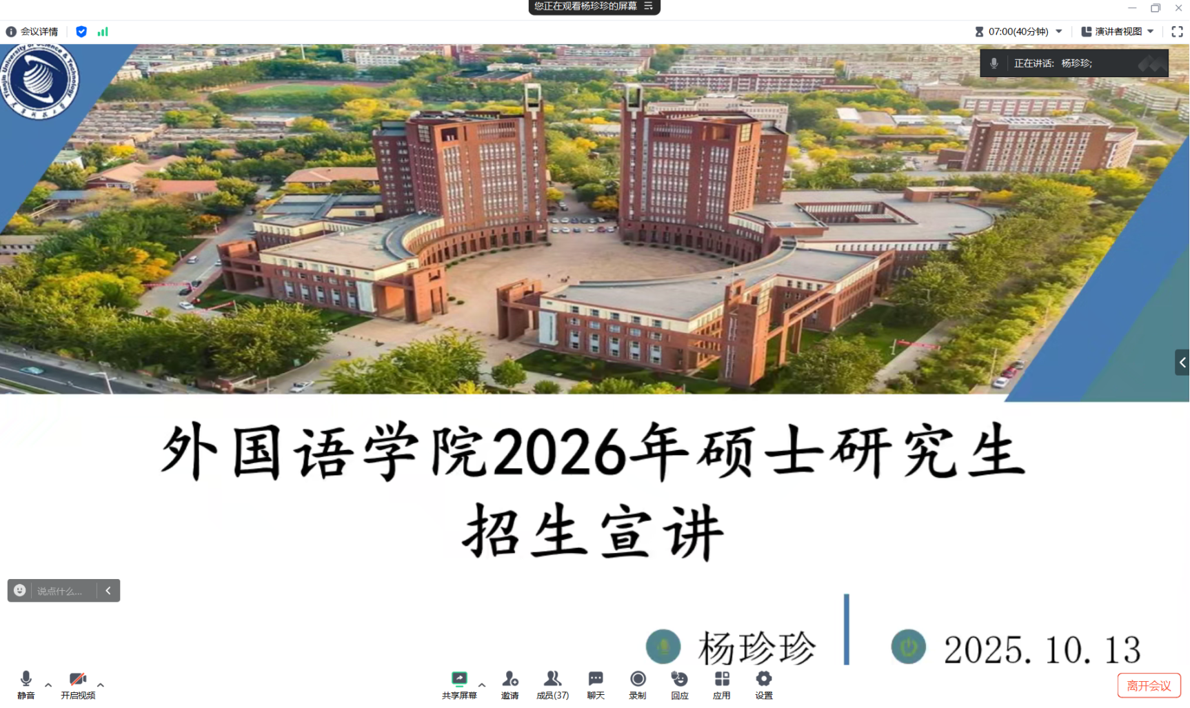 郑东升老师线上为内蒙古民族大学以及长春师范大学进行宣讲,将我院的招生信息与诚挚邀请带到了更广阔的地区。郑老师详细介绍了我院的师资力量、科研特色及奖助体系,并就考生们关心的历年录取情况进行了耐心细致的分析。