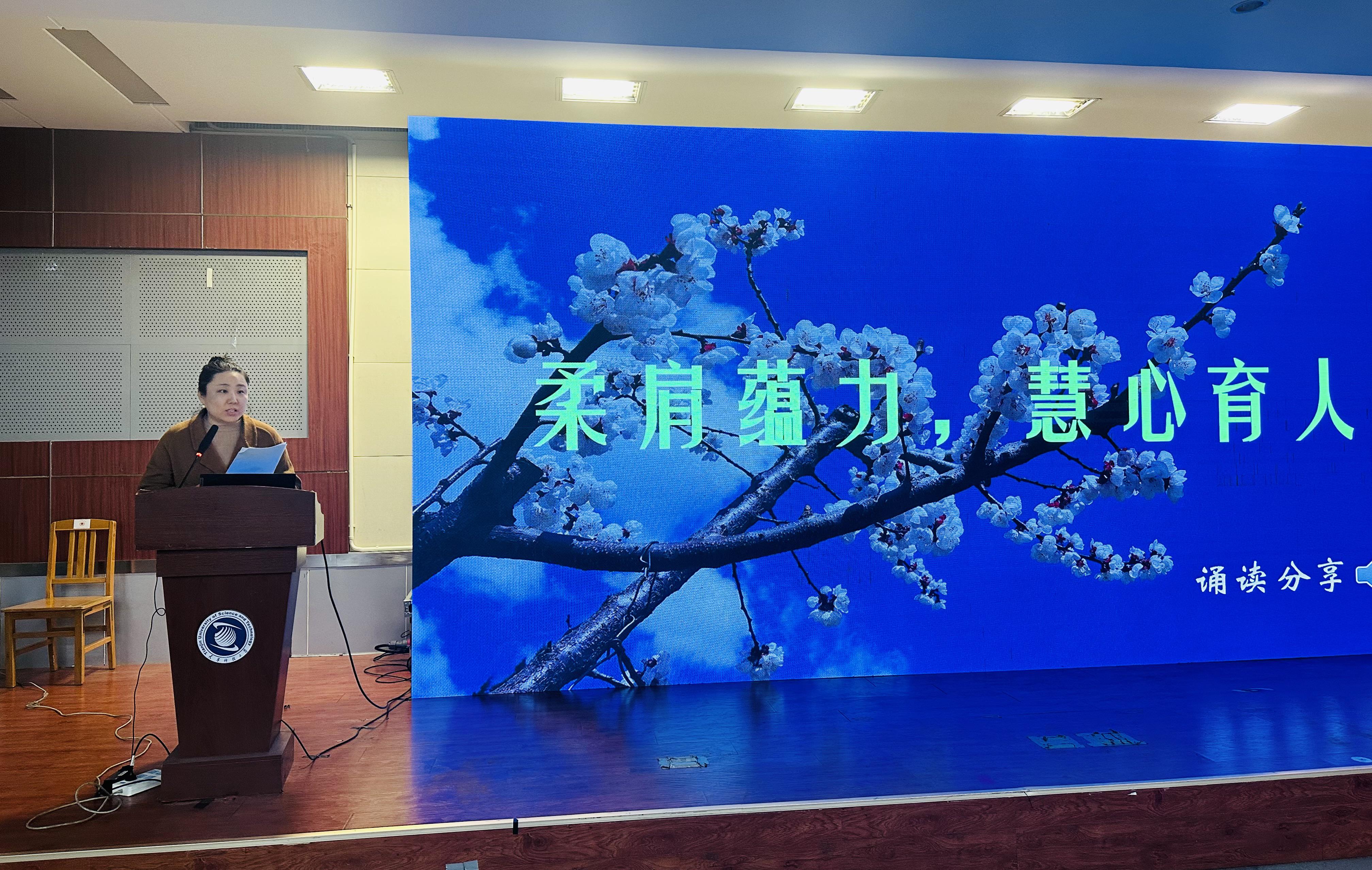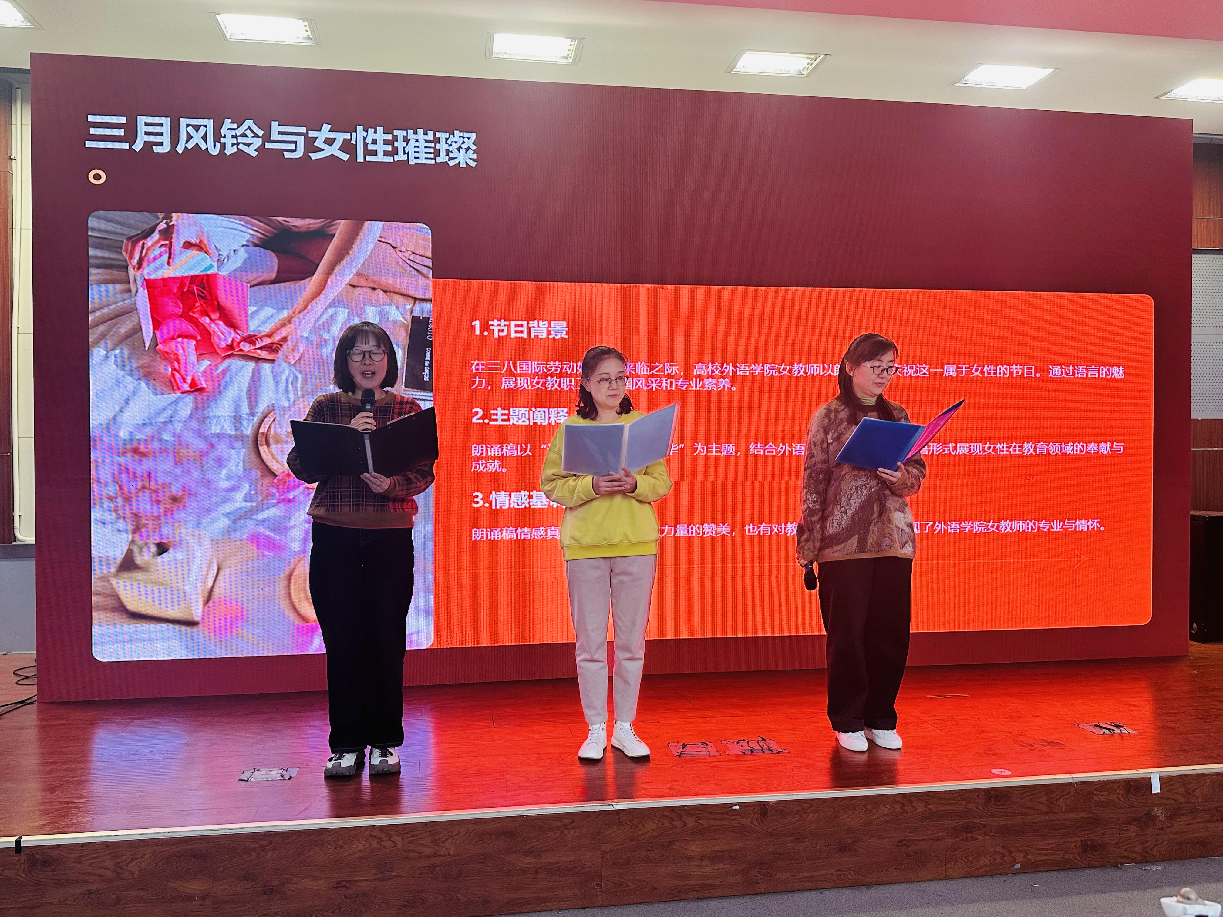您现在的位置: 首页 >> 新闻动态 >> 学院新闻 >> 我院开展“三八”国际劳动妇女节诵读分享活动——外语巾帼传声韵,初心筑梦显担当根据校工会统一部署,3月5日,外国语学院工会在滨海中校区图书馆第二报告厅举办“三八”国际劳动妇女节诵读分享活动。学院全体教职工踊跃参与,现场气氛热烈,活动内容精彩纷呈。 本次诵读分享以“外语巾帼传声韵,初心筑梦显担当”为主题,旨在通过诵读的艺术形式,彰显外语学院的专业特色,凝聚巾帼奋进力量。活动由学院工会统筹谋划、周密组织,男教工的积极投身更让活动亮点纷呈、别具一格。 来自各工会小组的教师们依次登台,用饱含深情的声音和专业的语言素养,演绎了一篇篇经典佳作与原创作品。英语系李娟、刘向东老师带来的《青春》,以流畅的英文诵读展现了青春的活力与理想;日语系邱爱杰、芮真慧、史倩倩老师共同演绎的《不畏风雨》,用日语传达出坚韧不拔的精神力量;翻译系郑东升老师则以《邓颖超和周恩来的革命爱情》深情讲述了革命先辈的感人故事,引发全场共鸣。