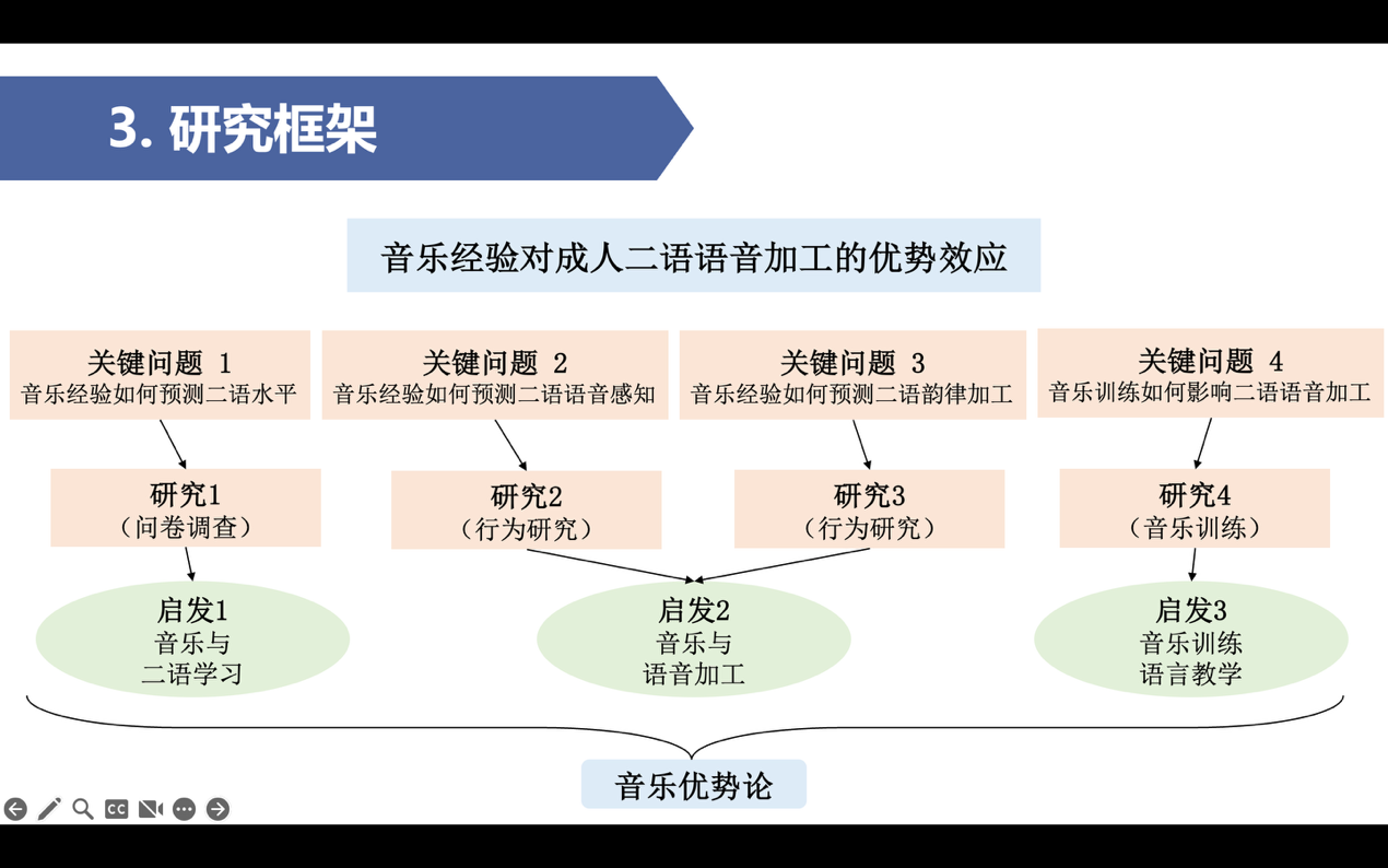 讲座中,王尤佳博士结合系列实证研究,深入探讨了音乐经验与语言学习之间的内在联系。她指出,音乐与语言在神经机制上存在高度重叠,音乐训练能够有效提升学习者的听觉感知、语音辨别及韵律加工能力,从而促进二语学习效果。 她详细介绍了音乐经验对二语水平的预测、语音感知、韵律加工的影响,以及短期音乐训练对成人二语语音加工的干预效果。研究结果显示,音乐经验尤其是音高与节奏维度的训练,显著提升英语和汉语二语学习者的语音感知与韵律理解能力。同时,视觉节奏训练等多模态训练方式在提升语音加工方面表现出更优效果。